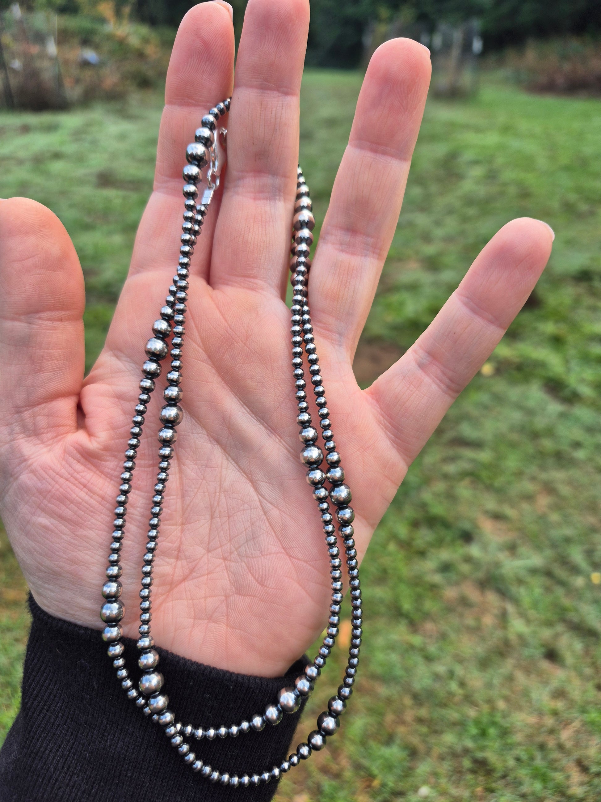 30" graduated from 3mm, 4mm, 5mm & 6mm Sterling silver pearls. Machine made Navajo handstrung.