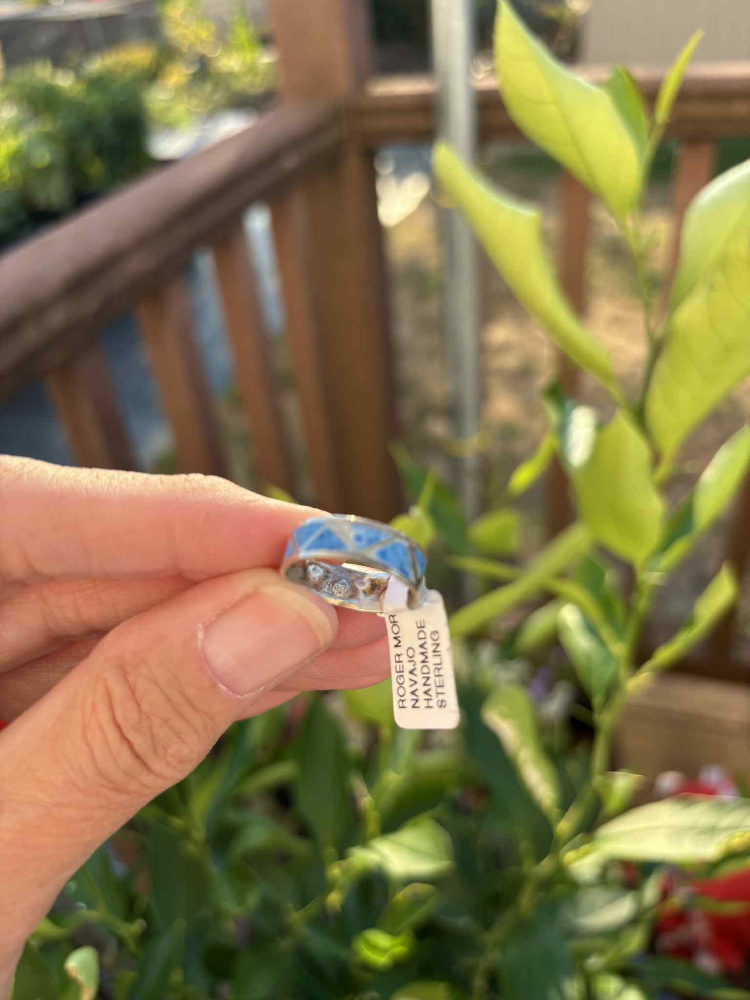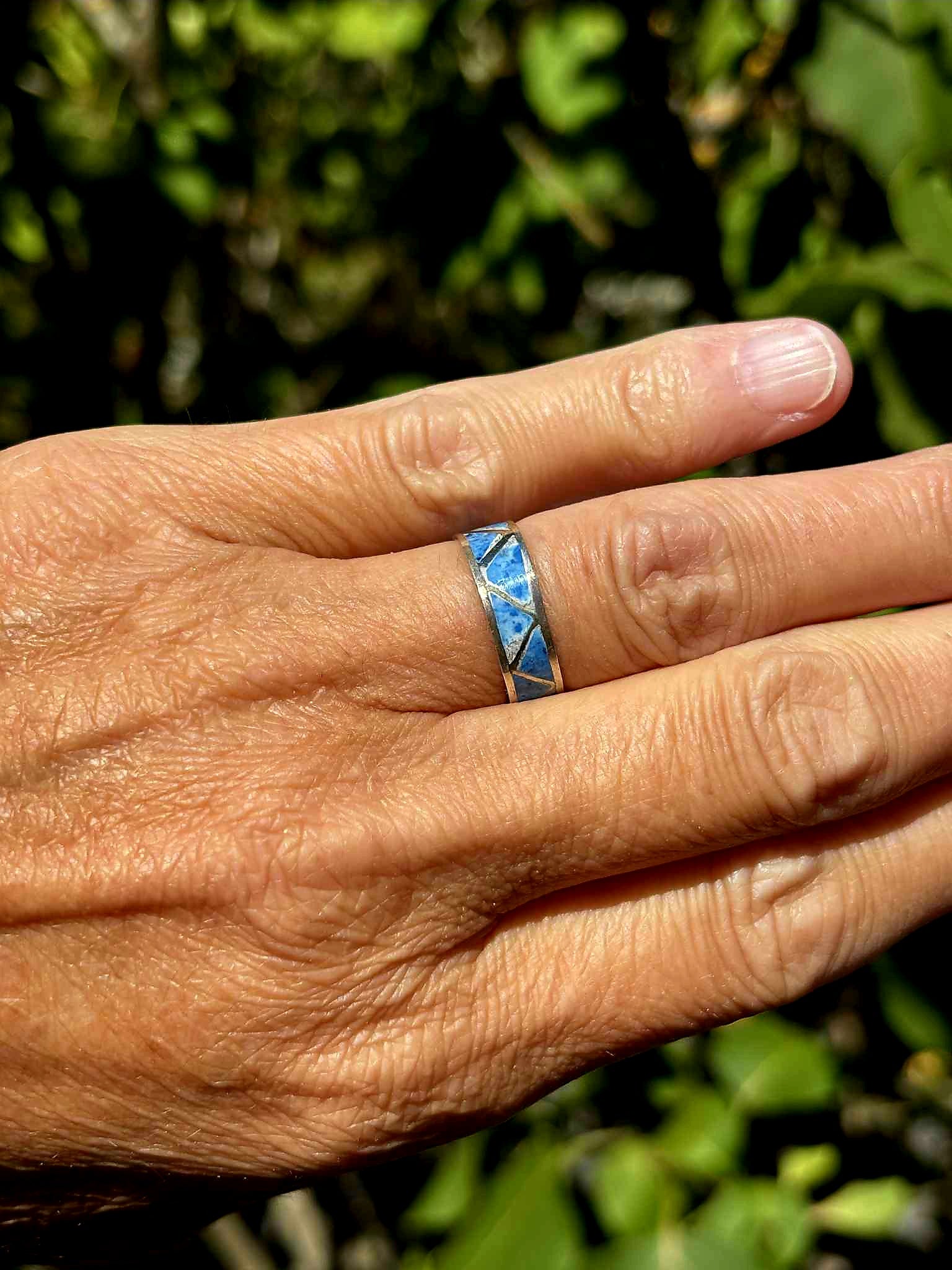 Pretty little Denim Lapis Inlay ring, navajo made by Rodger Morgan. 925 sterling.