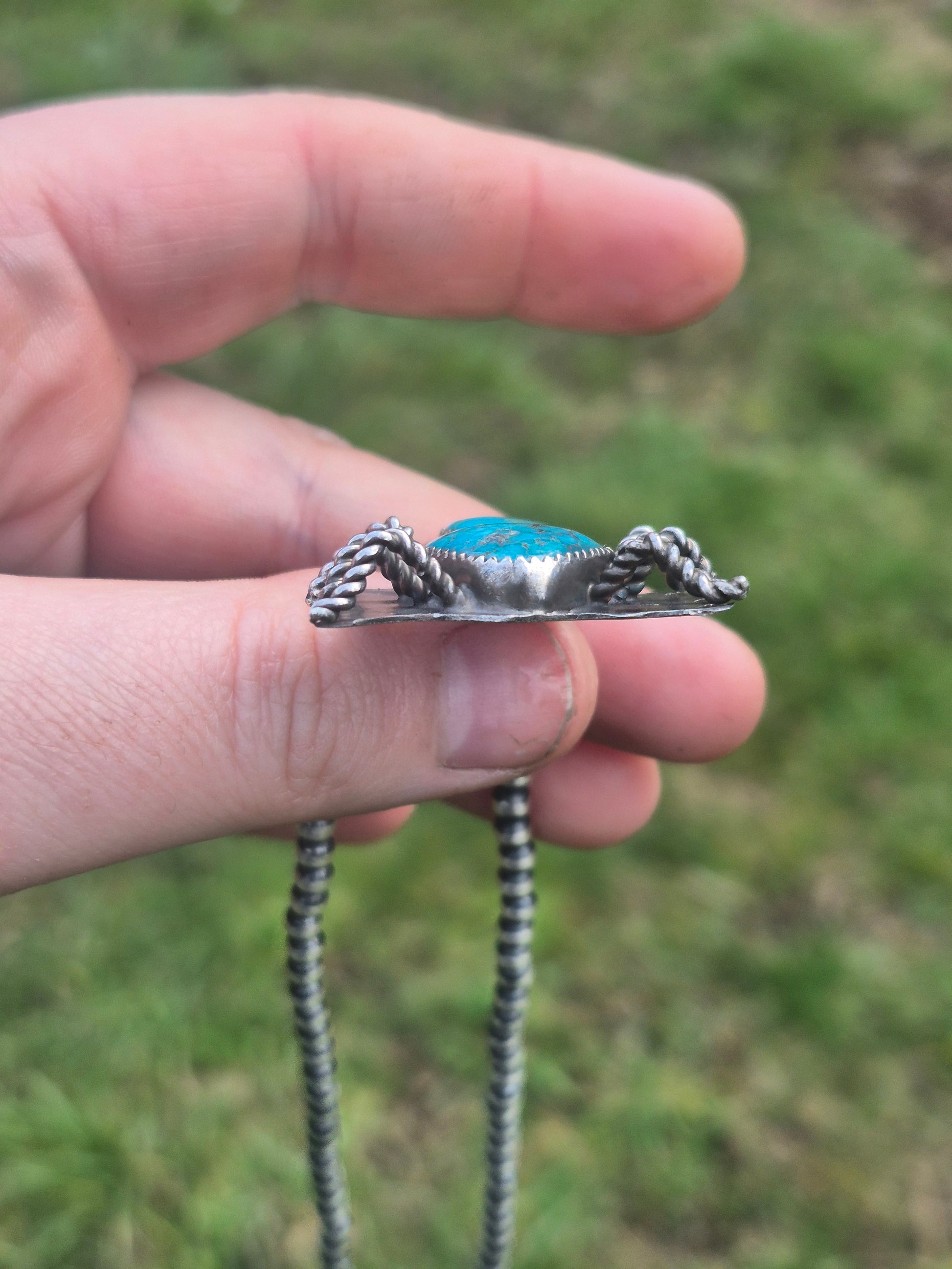 Made here at SVS by artist Hannah Coogan. This super unique, one of a kind spider pendant is made with pilot mountain turquoise & sterling silver. Sterling pearl necklace sold separately.