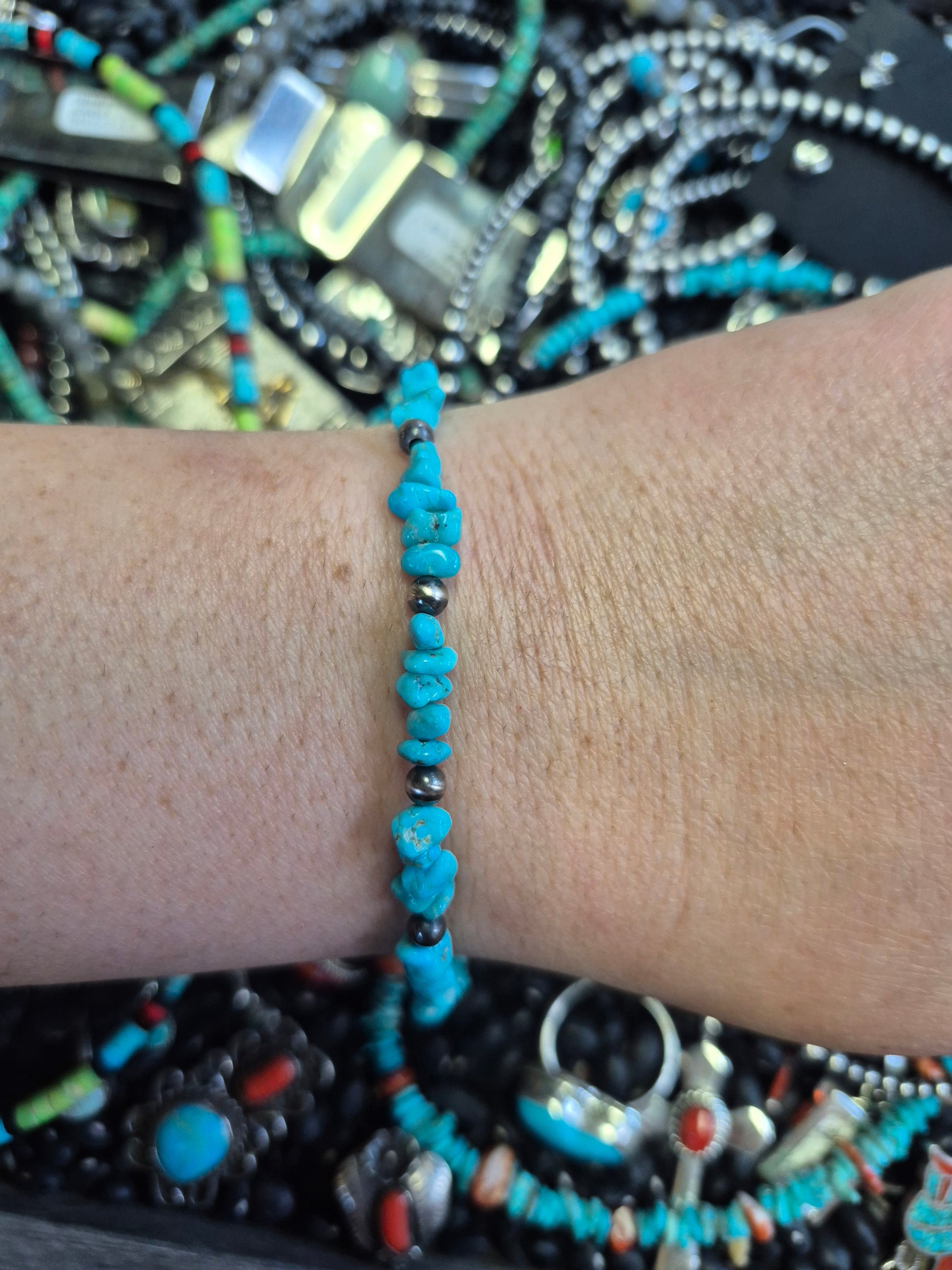 Made here at SVS, 7" bracelet with sleeping beauty nuggets & 4mm sterling silver pearls with sterling findings.