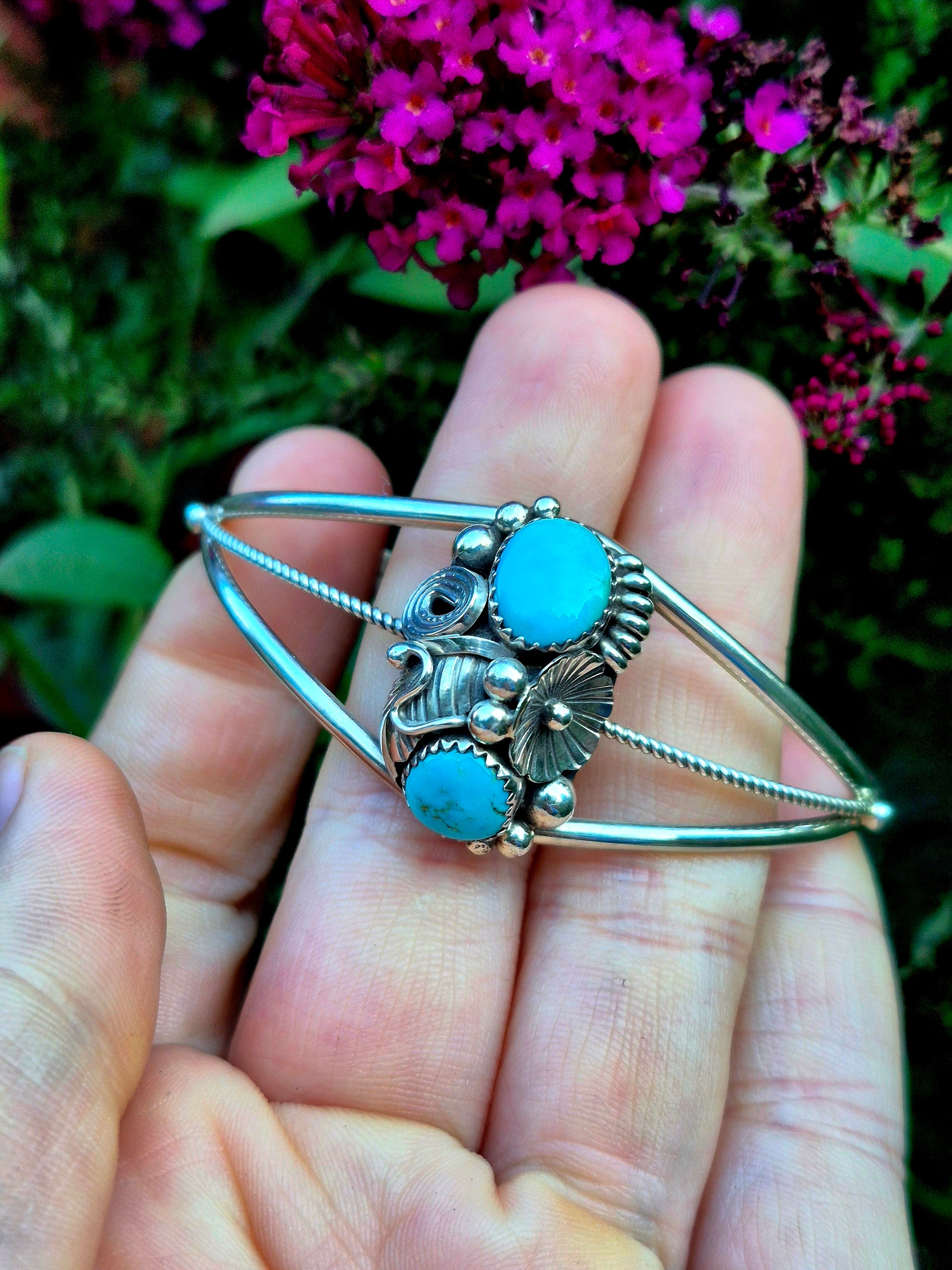 Stunning everyday cuff with 2 beautiful sleeping beauty stones. Fits 6"- 7" wrist with lots of flex. Signed "Max C", 925 sterling & vintage native.