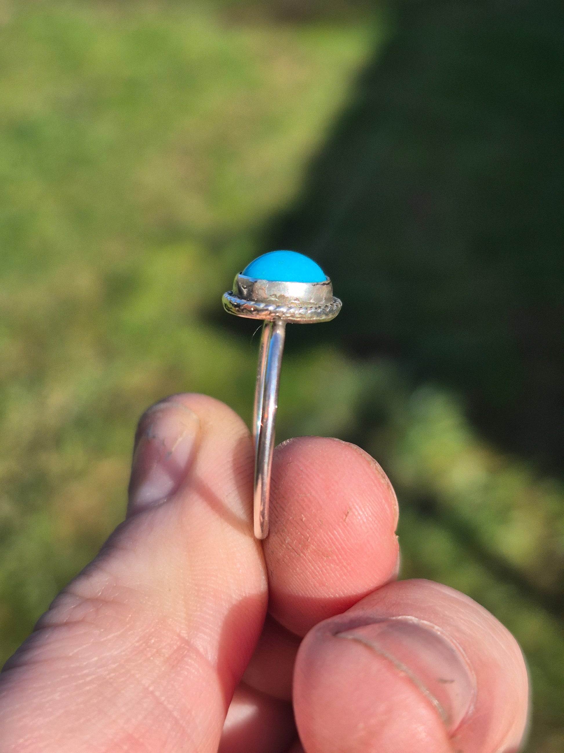 Made by us at SVS (artist is Hannah Coogan) sterling silver & sleeping beauty Turquoise in a size 8.5 ring.