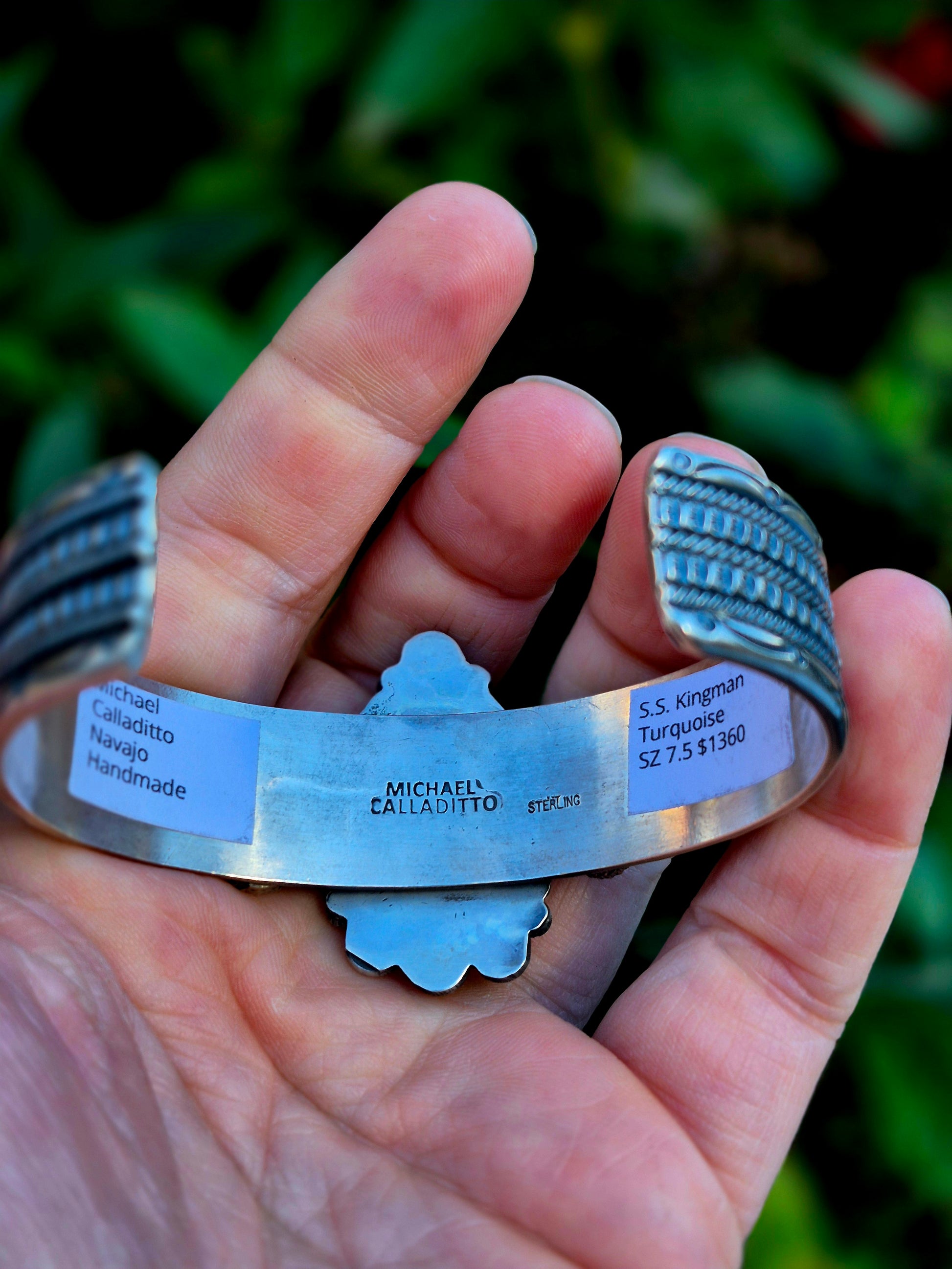 Large, fits 7.5" + has some flex to it. Nice weight- lots of silver with a stunning Kingman stone. Navajo made by Michael Calladitto. 925 sterling.